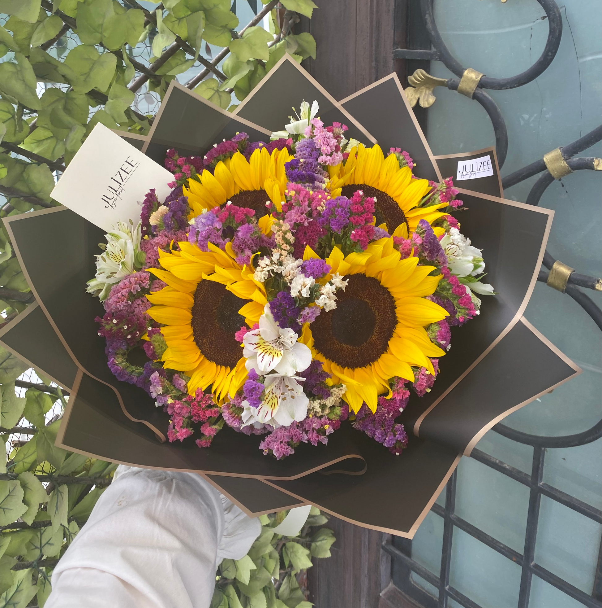 Un detalle lleno de vida y color con 4 girasoles radiantes, acompañados de statice en tonos vibrantes y delicadas astromelias. Envuelto en papel moderno con elegante listón de tela, este ramo transmite alegría, energía positiva y optimismo, ideal para iluminar cualquier día. 🌻💛