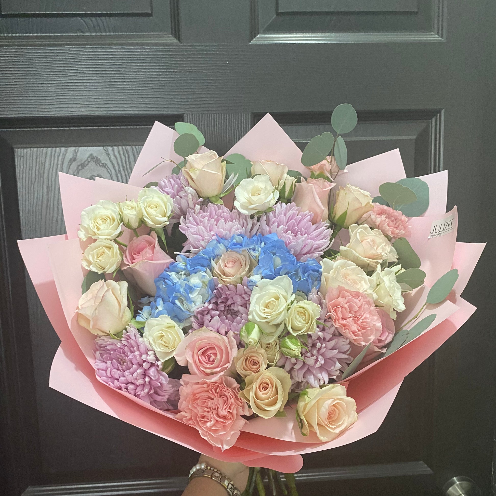 Este bello bouquet combinando con variedad de flores de alta calidad: rosas, mini rosas, claveles, hortensia, roxanas y más, creando una explosión de texturas y colores.