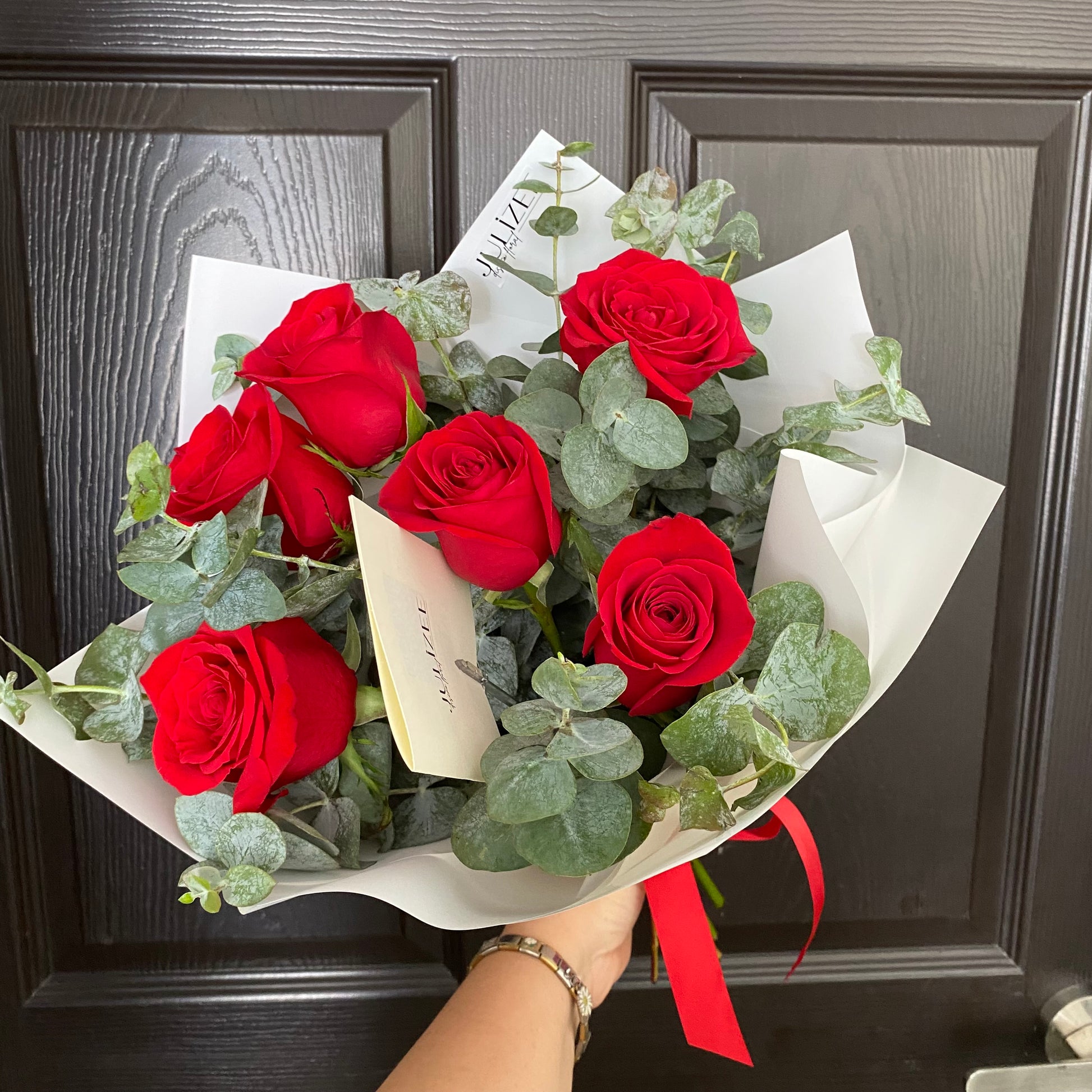 Ramo con seis rosas rojas premium y eucalipto fresco, envuelto en papel blanco con listón rojo. Un detalle sobrio y con carácter, que refleja elegancia y fuerza. Ideal para hombres que aprecian los detalles con estilo y distinción.