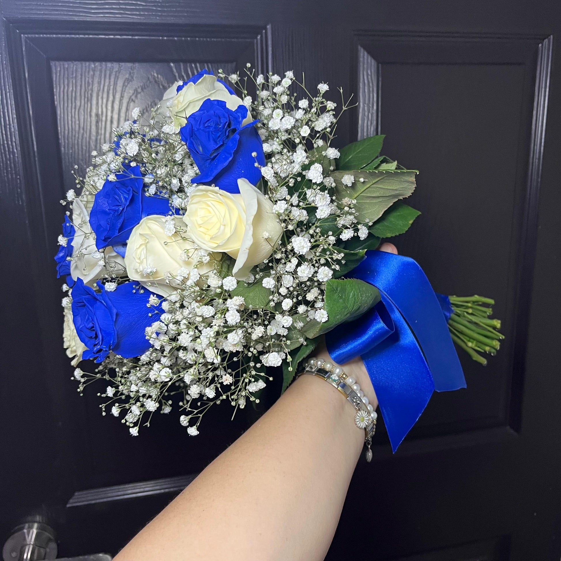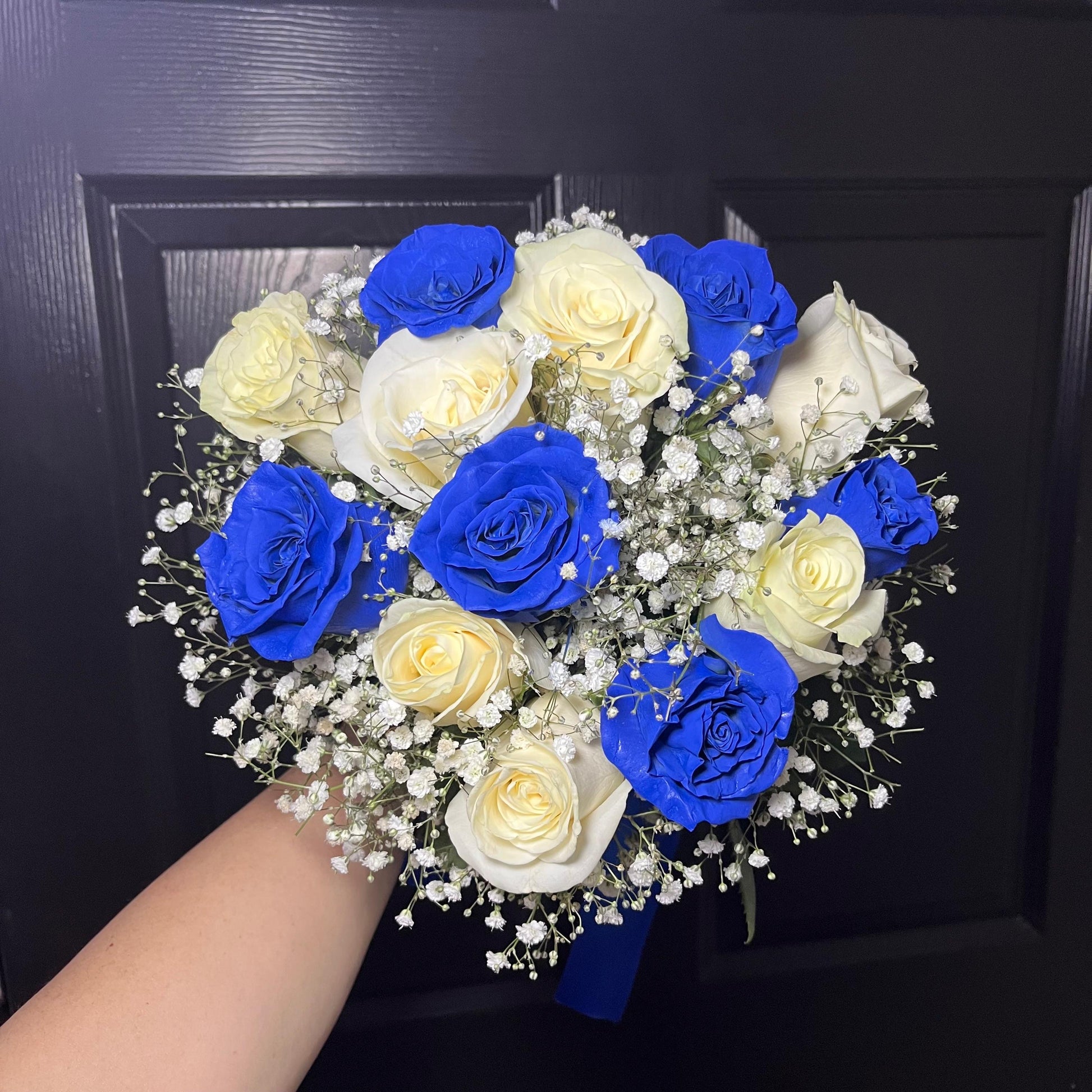 Un elegante ramo de 13 rosas combinadas en tonos azul intenso y blanco puro, realzadas con el toque delicado de la nube (gypsophilia). Su contraste transmite armonía, frescura y distinción, simbolizando la pureza de los sueños y la fortaleza de una nueva etapa. Perfecto para una quinceañera que desea lucir única, radiante y llena de magia en su día especial.
