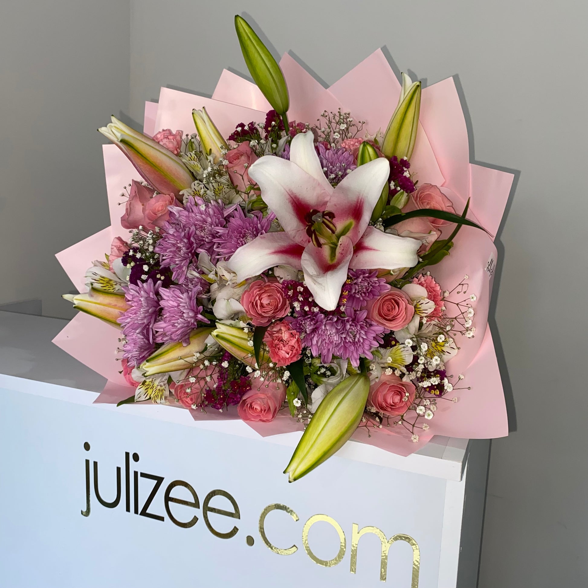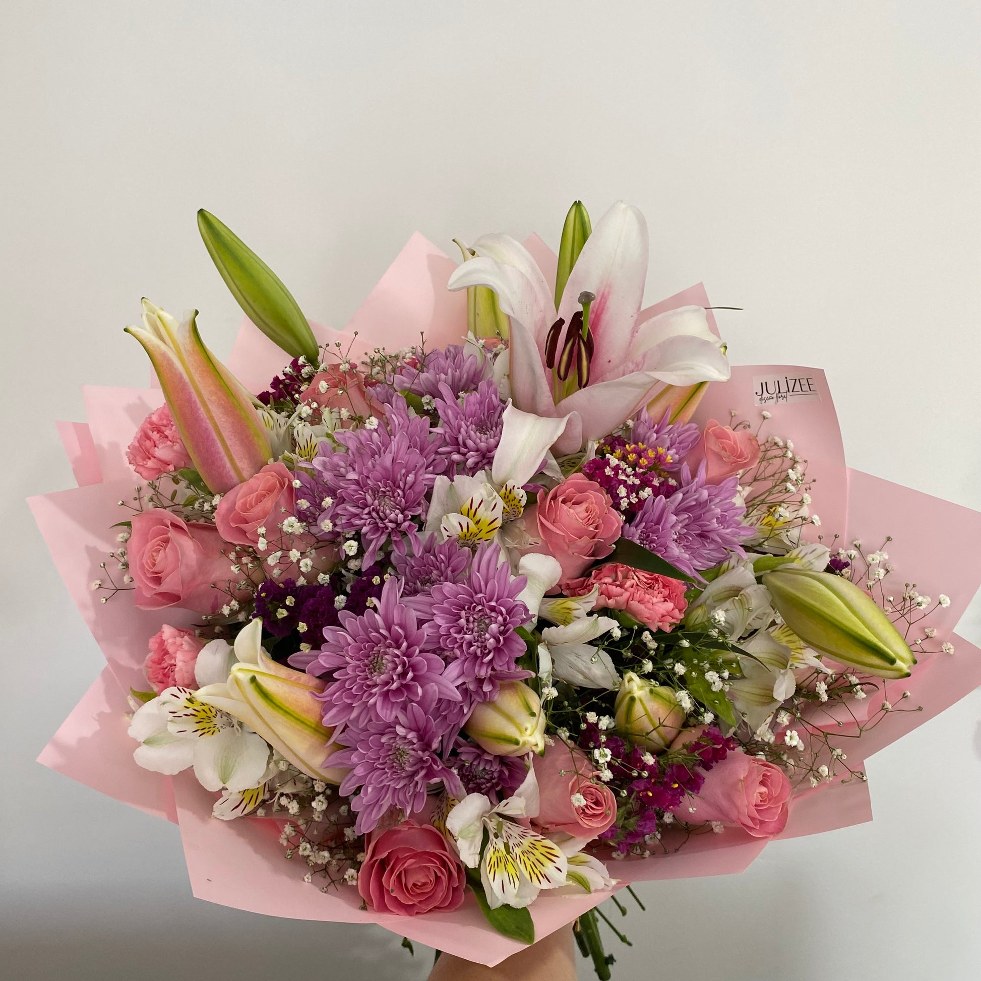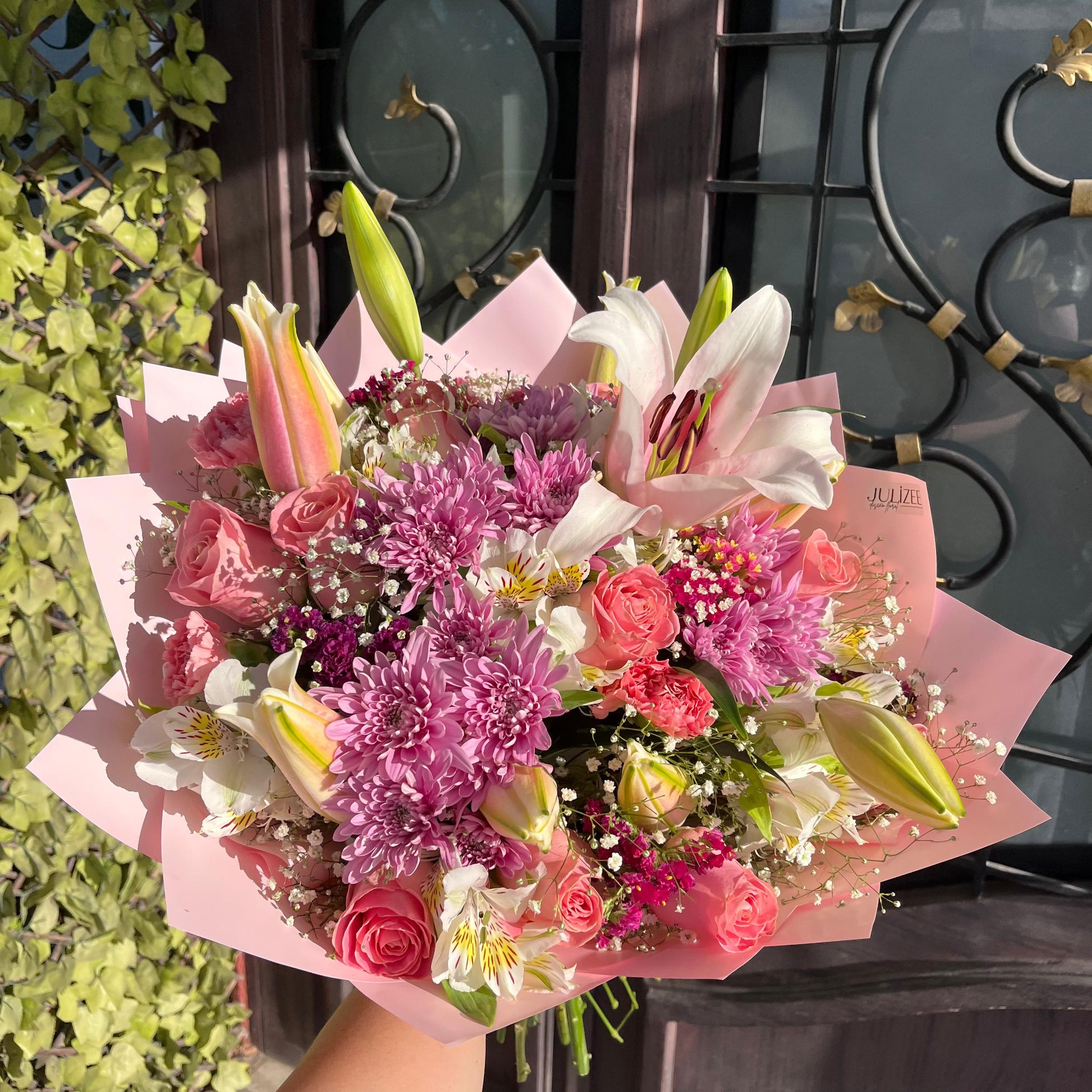 Un arreglo lleno de frescura y color con 12 rosas en tonos suaves, elegantes lirios, claveles y vibrantes margaritas prada, delicadas astromelias y un toque de follajes que realzan su belleza natural. Su combinación armónica lo convierte en un detalle especial para cumpleaños, aniversarios o simplemente para iluminar cualquier ocasión con ternura y elegancia. 🌸💗