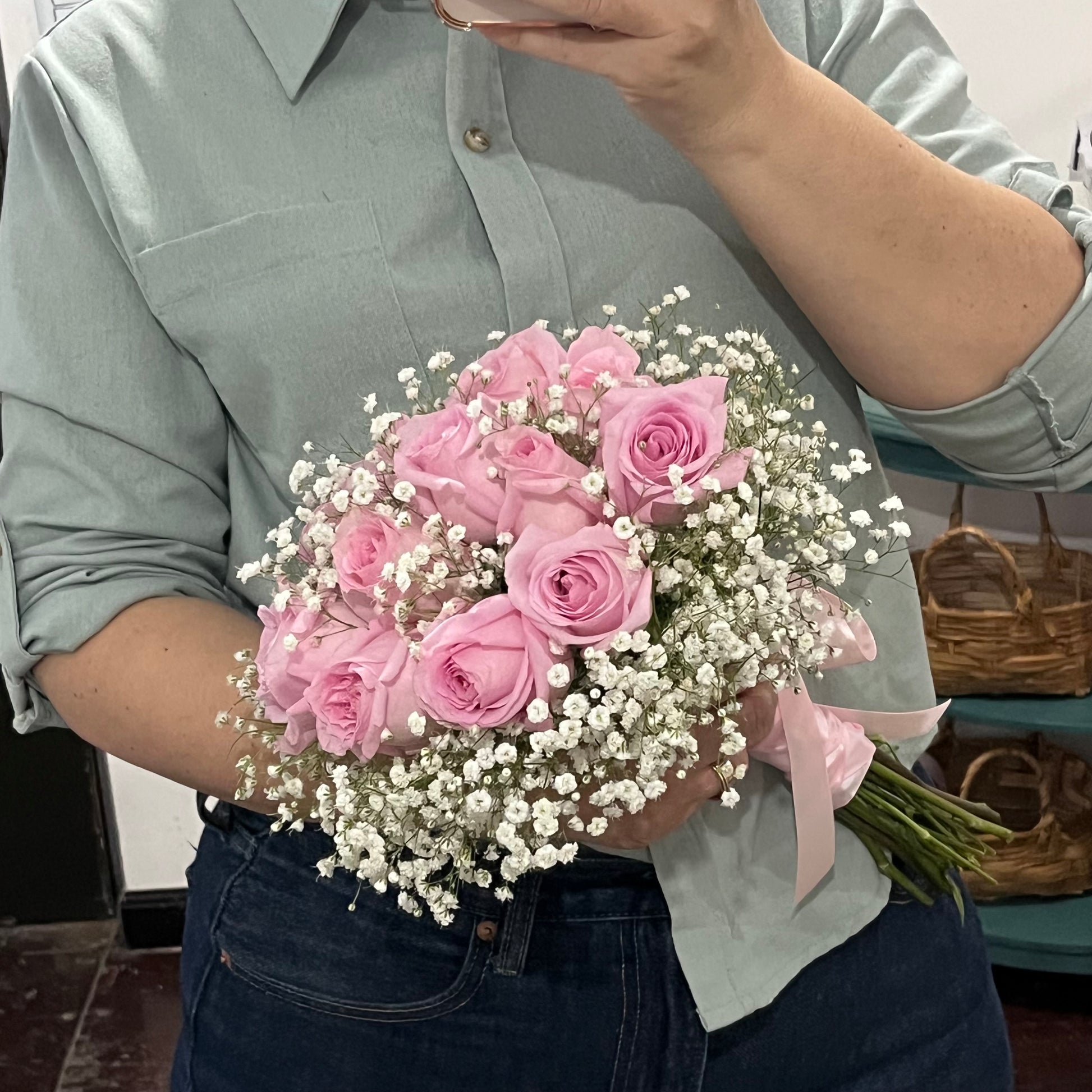 Un delicado ramo de 12 rosas rosas enmarcadas con el encanto sutil de la nube blanca (gypsophilia), que refleja ternura, dulzura y pureza. El listón rosa que lo acompaña simboliza la alegría de esta etapa tan especial, convirtiéndolo en el accesorio perfecto para resaltar la belleza y elegancia de una quinceañera.