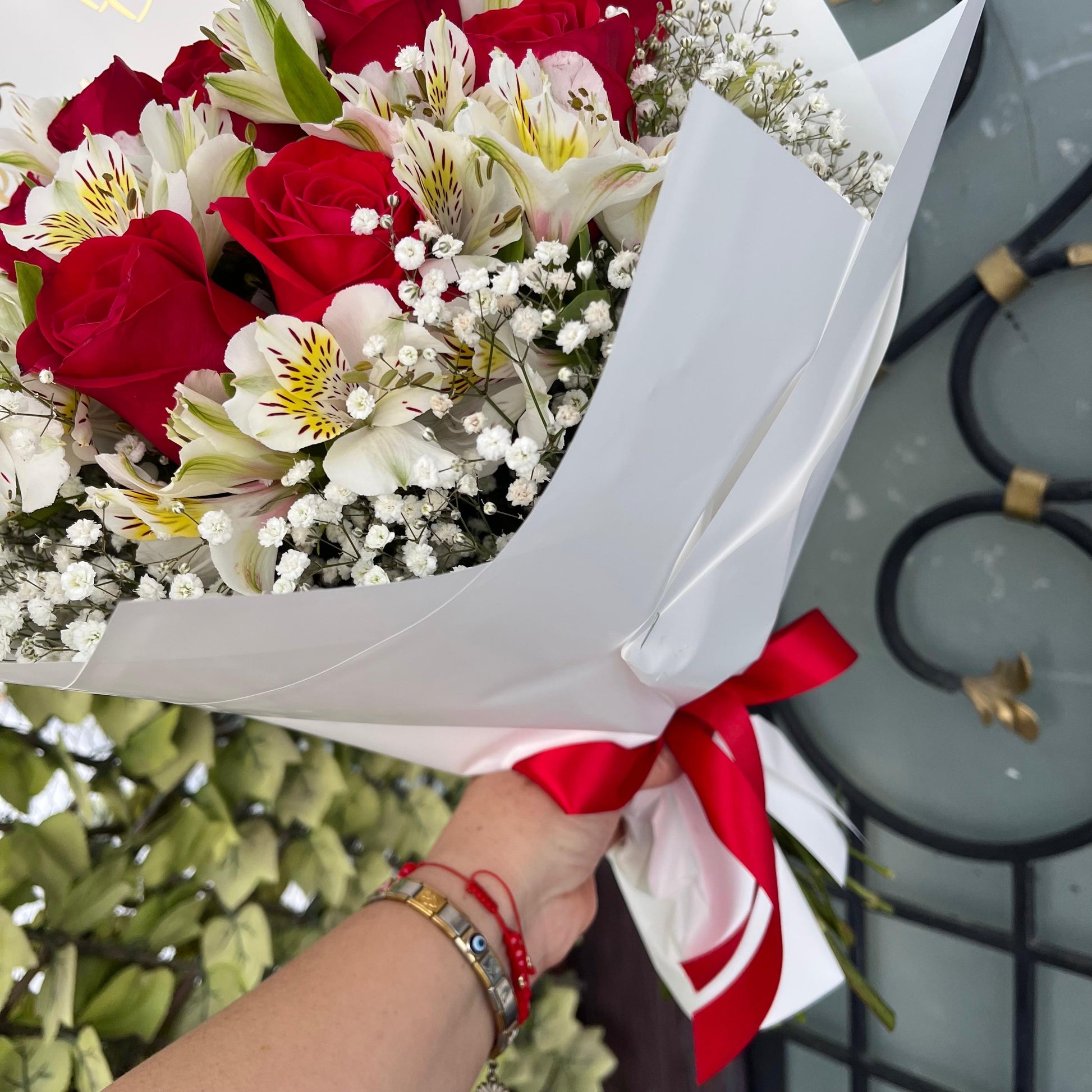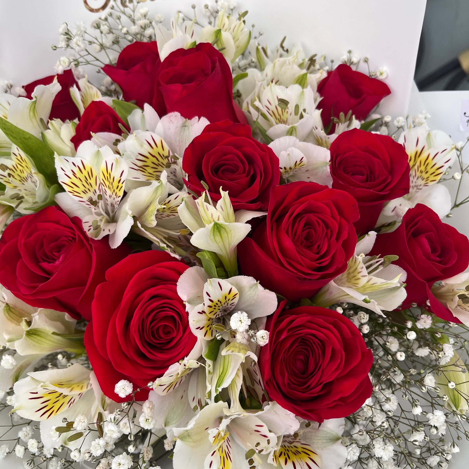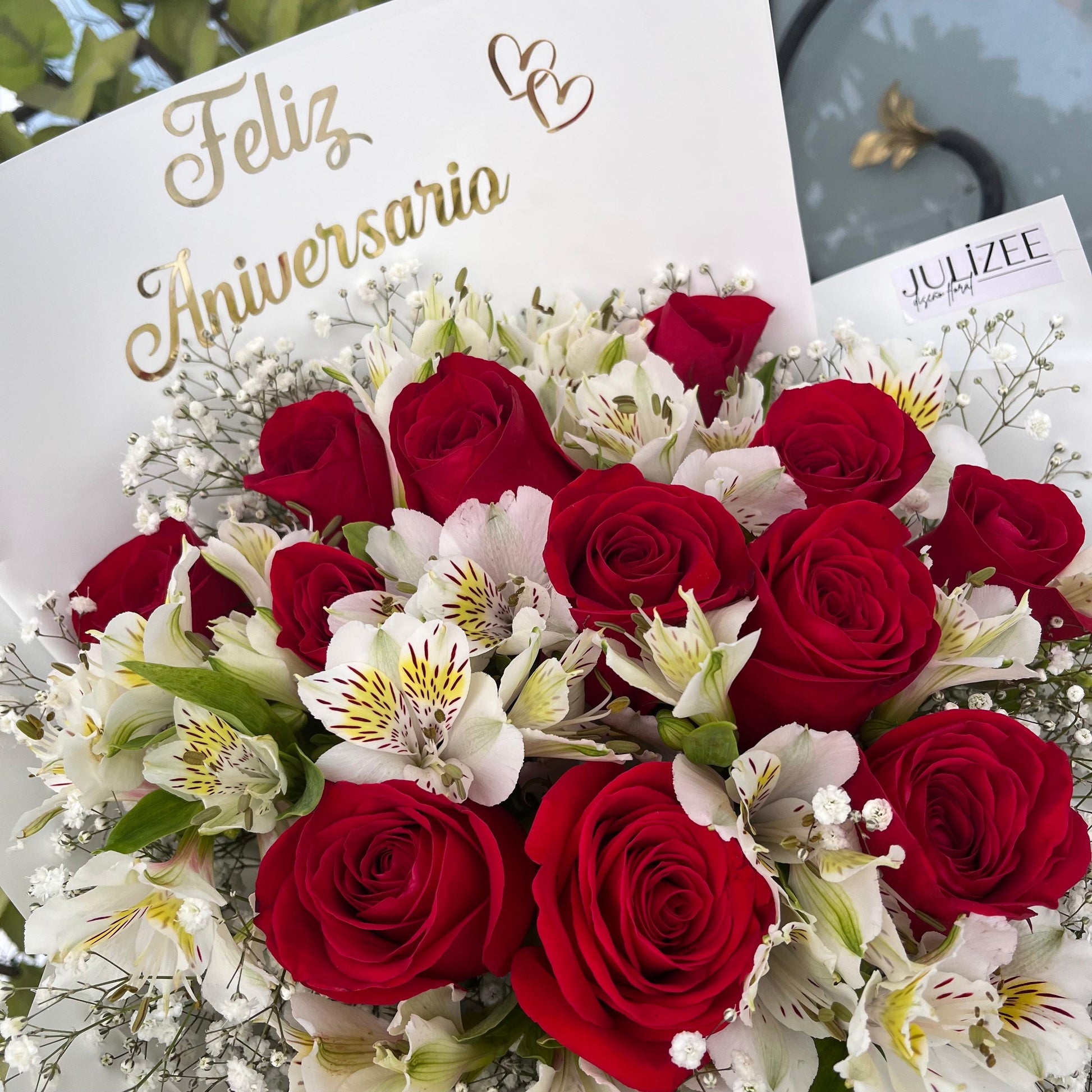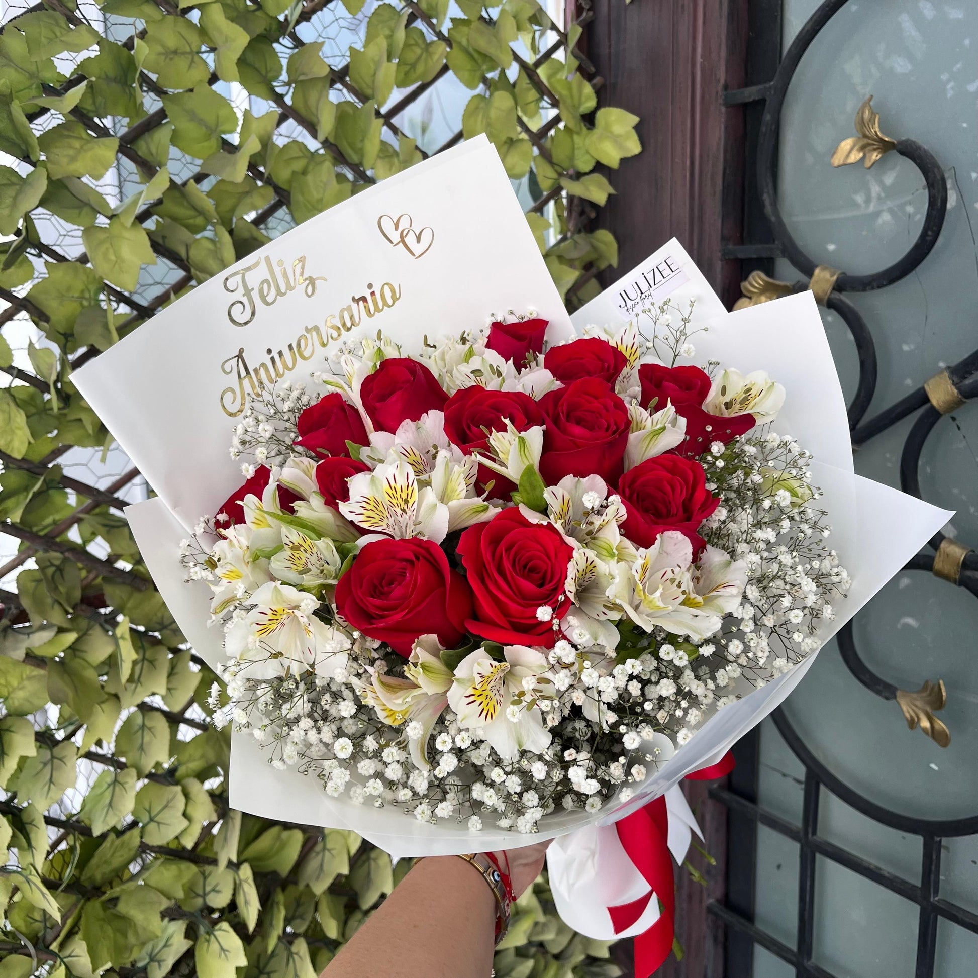 Hermoso ramo compuesto por 12 rosas rojas, símbolo de romanticismo, acompañado de delicadas astromelias blancas que representan pureza y unión, y un suave toque de gypsofilia que aporta frescura y encanto. Todo está envuelto en papel moderno con un elegante listón de tela, adornado con un letrero que dice “Feliz Aniversario”, ideal para celebrar ese día tan especial y único.