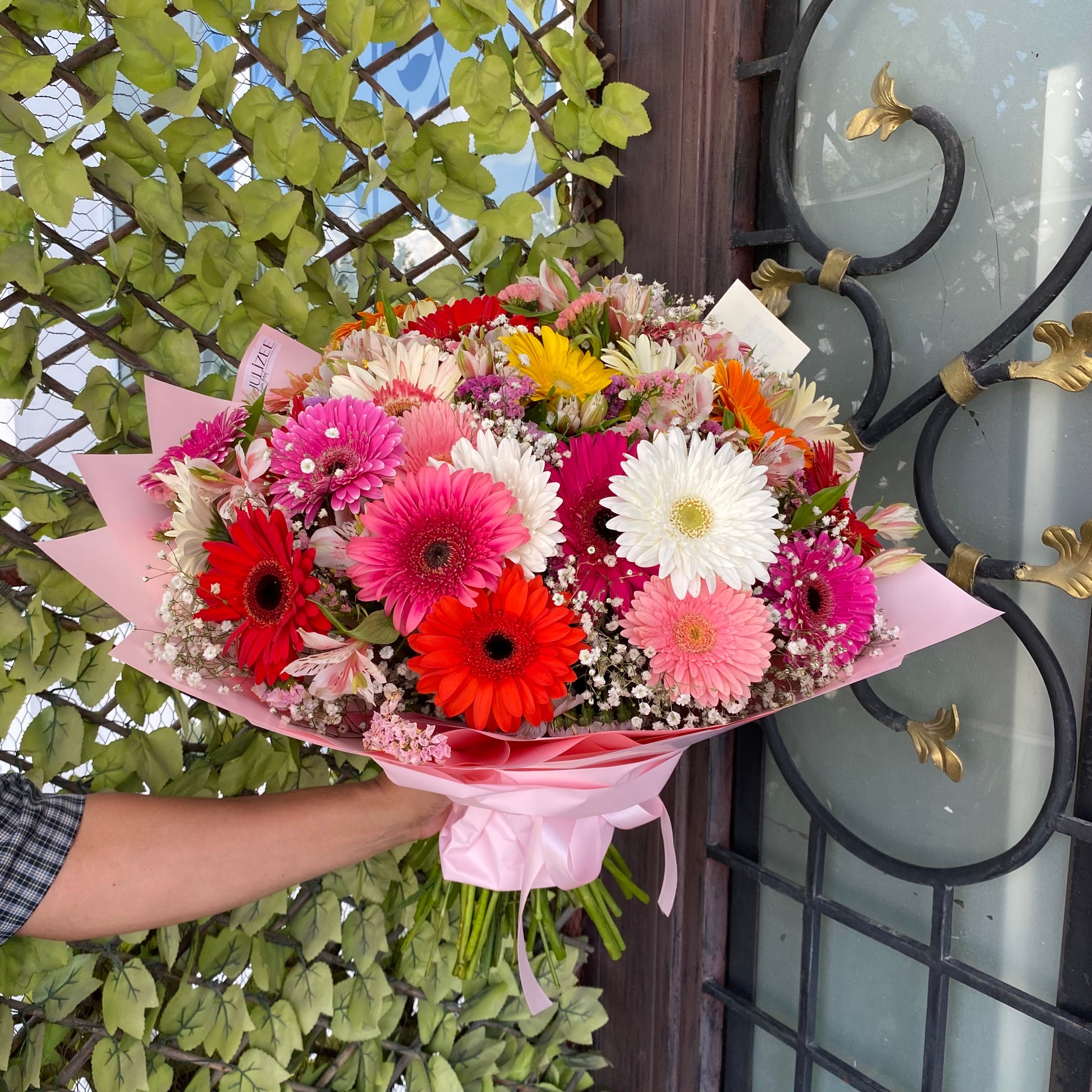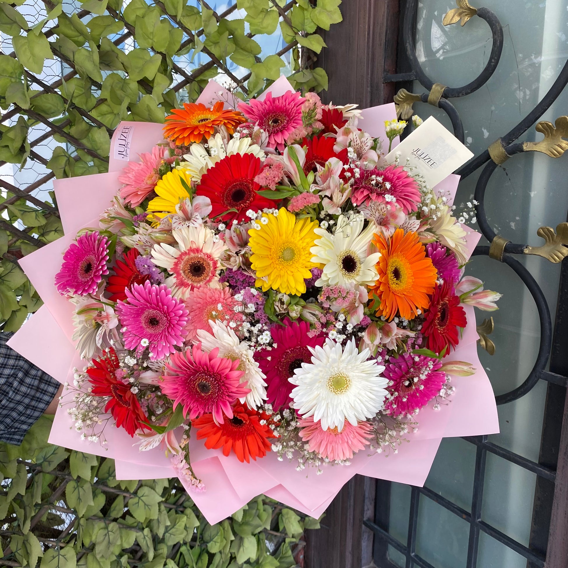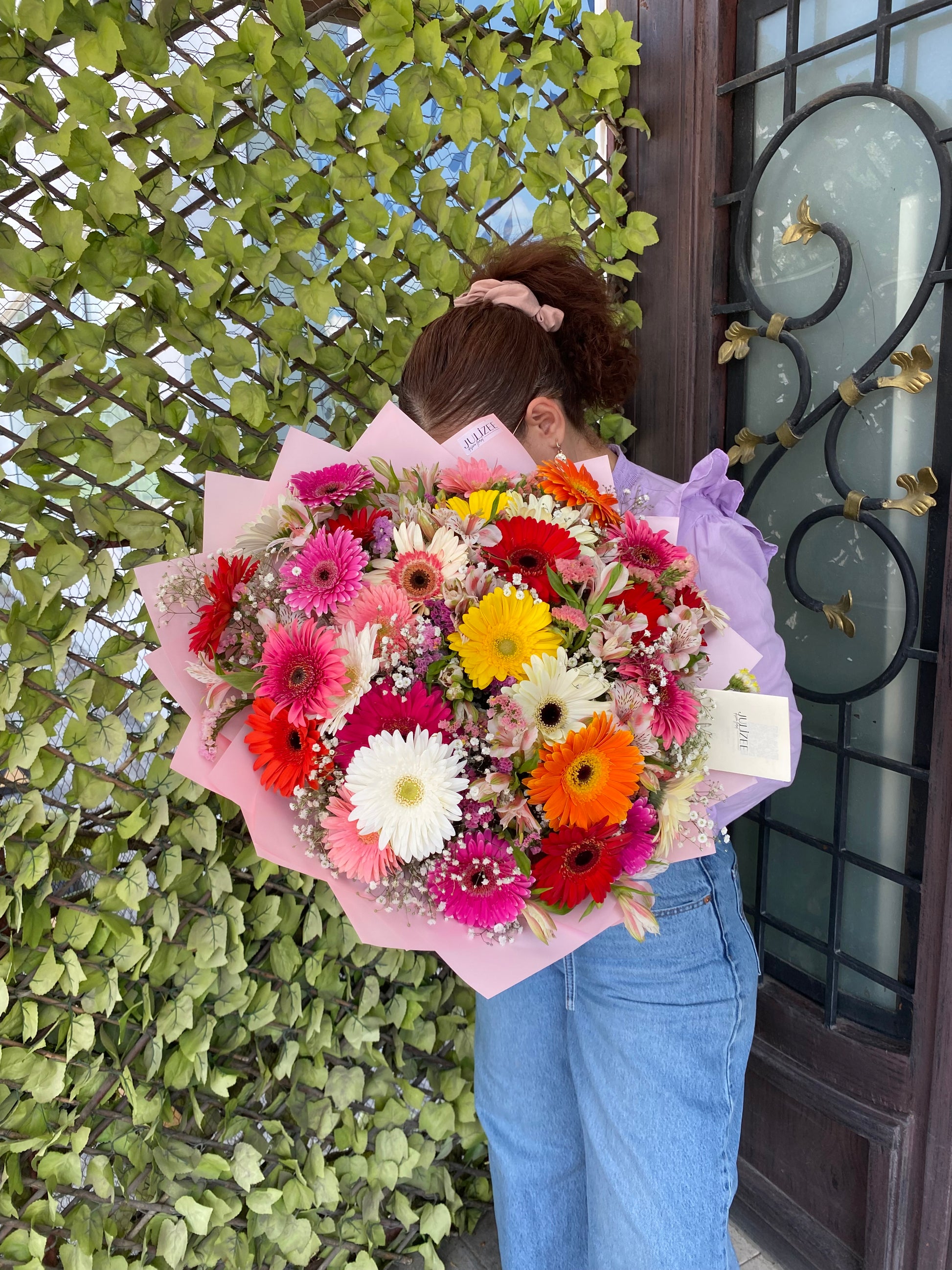 Este ramo es un estallido de color y ternura. Está compuesto por 30 gerberas en tonos alegres como rojo, rosa, fucsia, blanco, amarillo y naranja, que llenan de vitalidad y energía la vista. Se acompañan con la delicadeza de las astromelias, el toque ligero del statice y la dulzura del baby’s breath, creando un contraste encantador entre lo vibrante y lo suave.