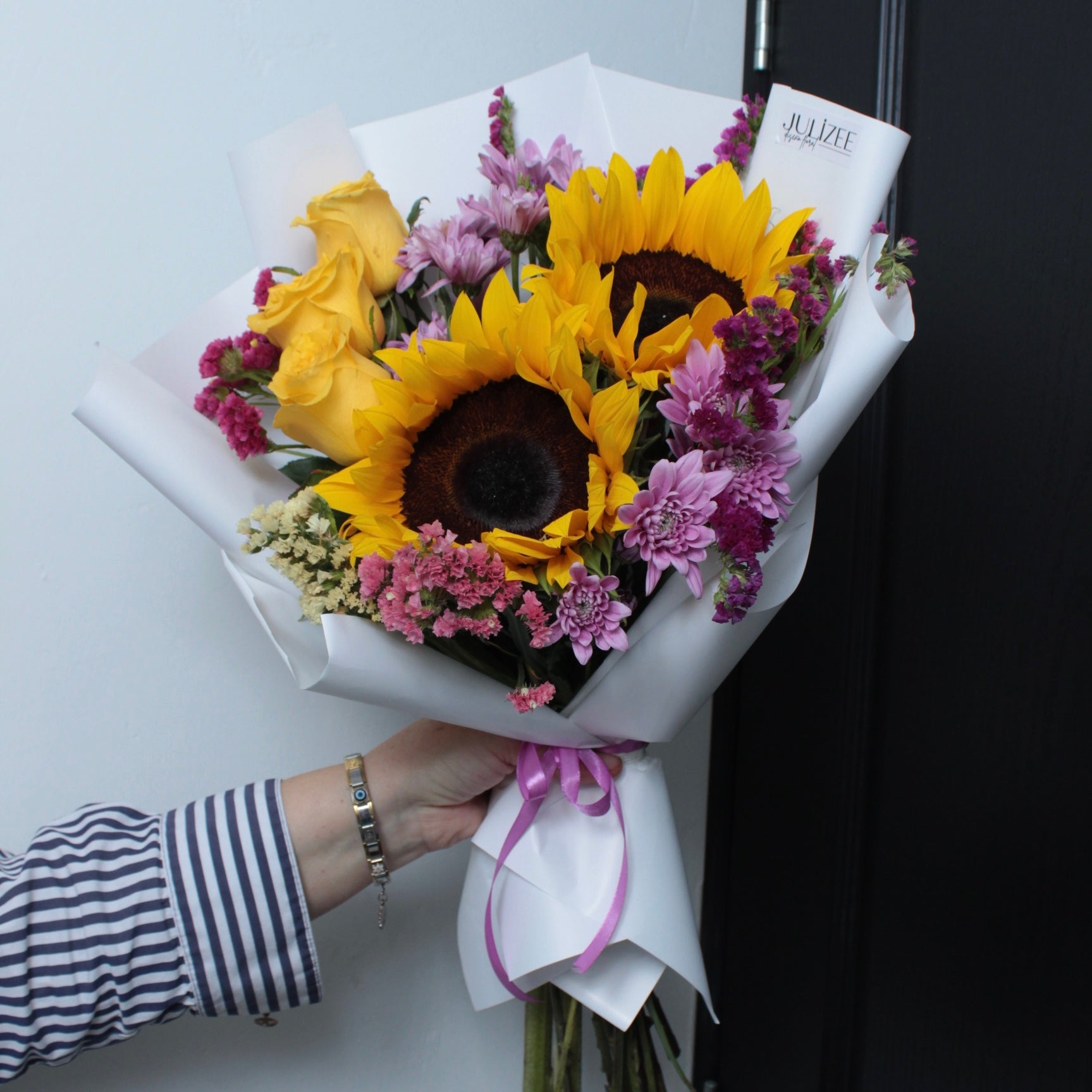 ✨ Un encantador ramo que evoca la ternura de los cuentos de hadas. Dos girasoles radiantes iluminan como el sol de la torre, acompañados de tres rosas amarillas que reflejan la dulzura y esperanza de un corazón libre. Entre ellos, margaritas prada aportan un aire silvestre y delicado, mientras el follaje abraza suavemente cada flor, creando armonía. Todo envuelto en fino papel y moño de tela , como si guardara un secreto mágico digno de un cuento de Rapunzel. 🌻🌹✨