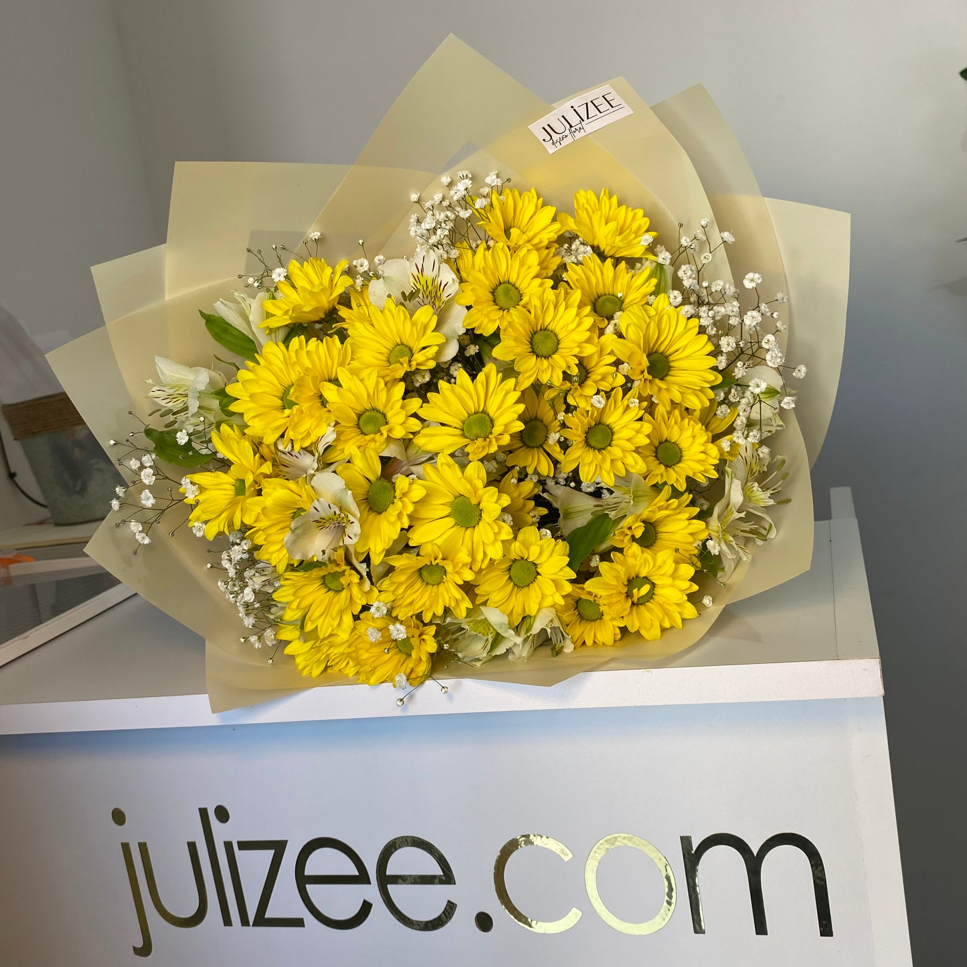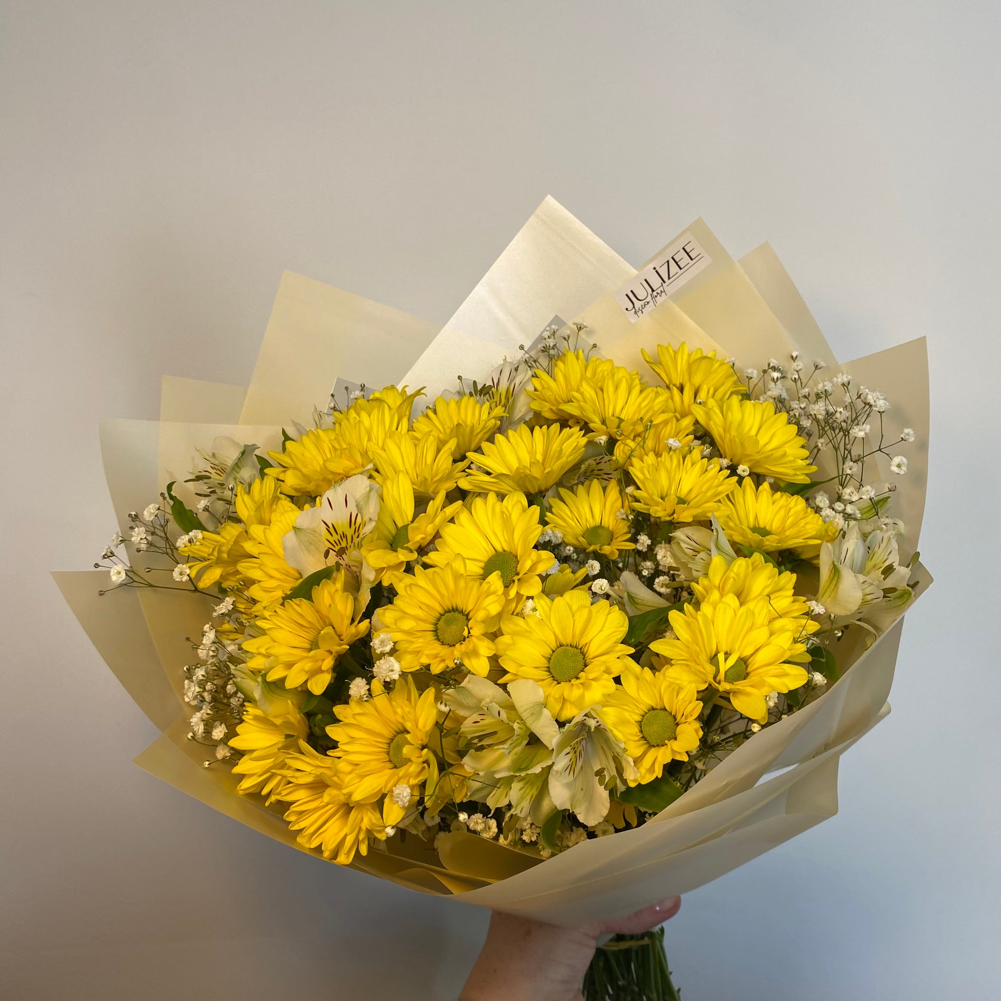 ✨ “Un ramo lleno de frescura y encanto, compuesto por radiantes margaritas amarillas que transmiten alegría, optimismo y nuevos comienzos. Acompañado de delicadas astromelias blancas y el toque romántico de la baby breath, es el detalle ideal para iluminar el día de alguien especial con ternura y vitalidad.”