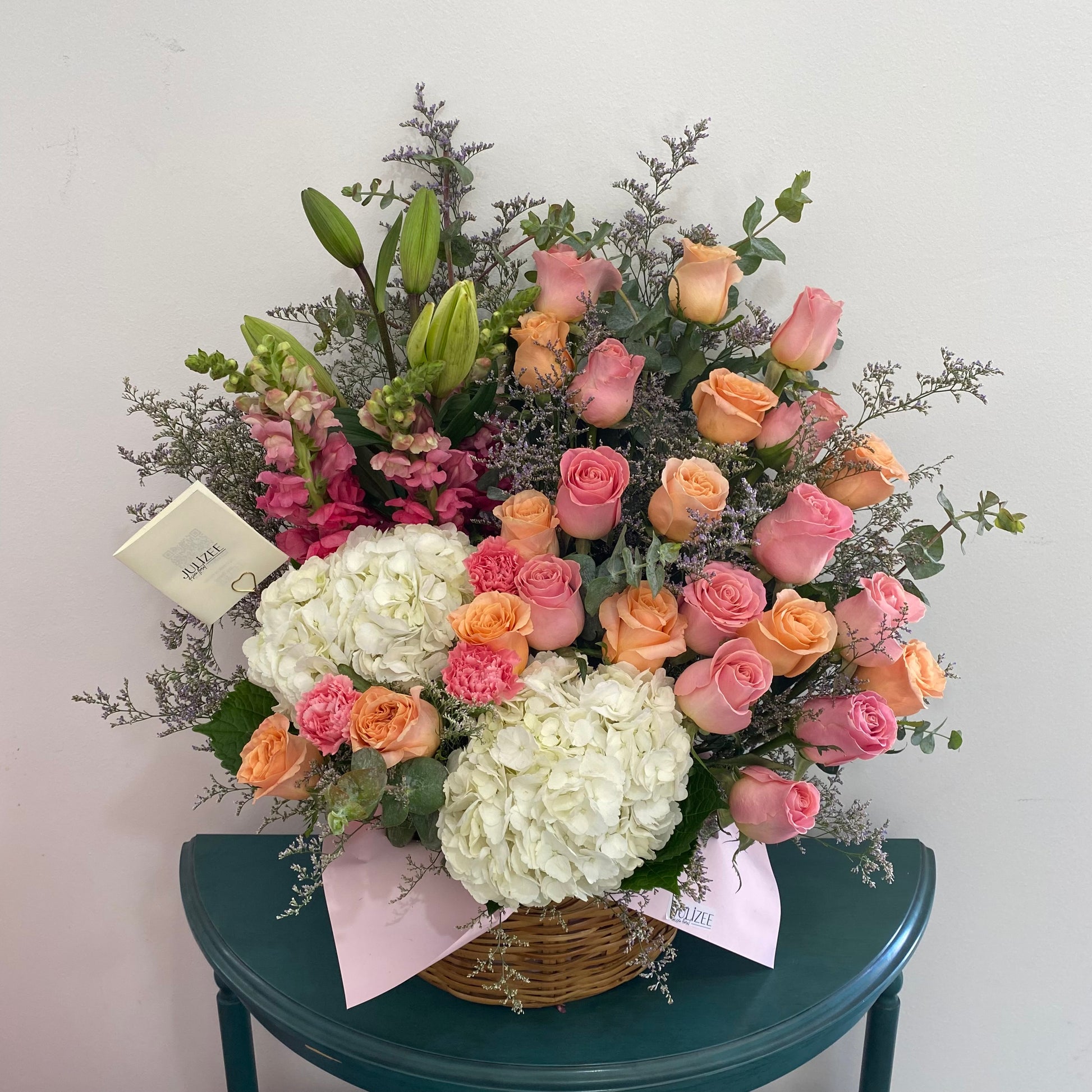 Una elegante canasta que combina la frescura de 24 rosas shimmer y rosado, con la suavidad de las hortensias blancas. Los perritos y claveles en tonos vivos aportan un aire alegre, mientras que los lirios en botón prometen abrirse con delicadeza. Las varas de eucalipto y el follaje fino enmarcan este diseño, creando un arreglo lleno de vida, armonía y elegancia. 🌸💫