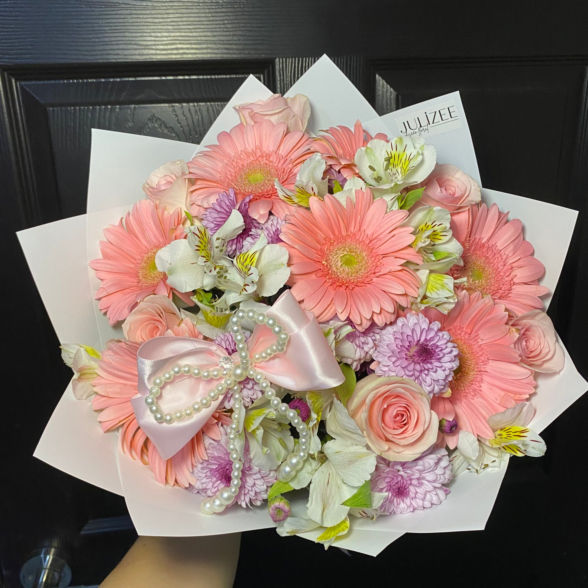 Este bello bouquet combinando con variedad de flores de alta calidad: 8 rosas, 7 gerberas , margaritas , astromelias y más, creando una explosión de texturas y colores.