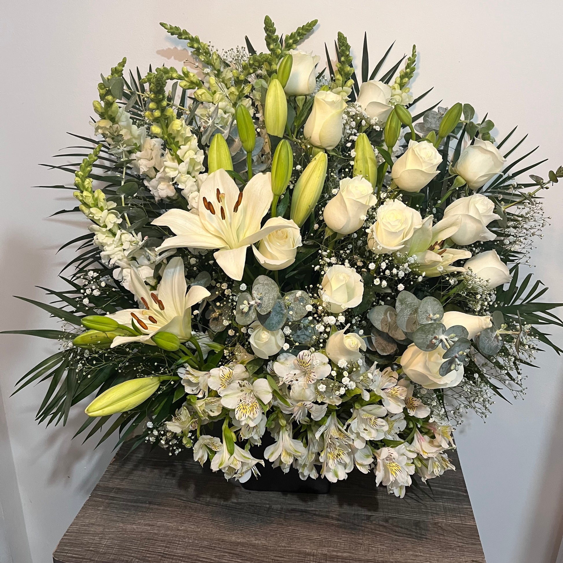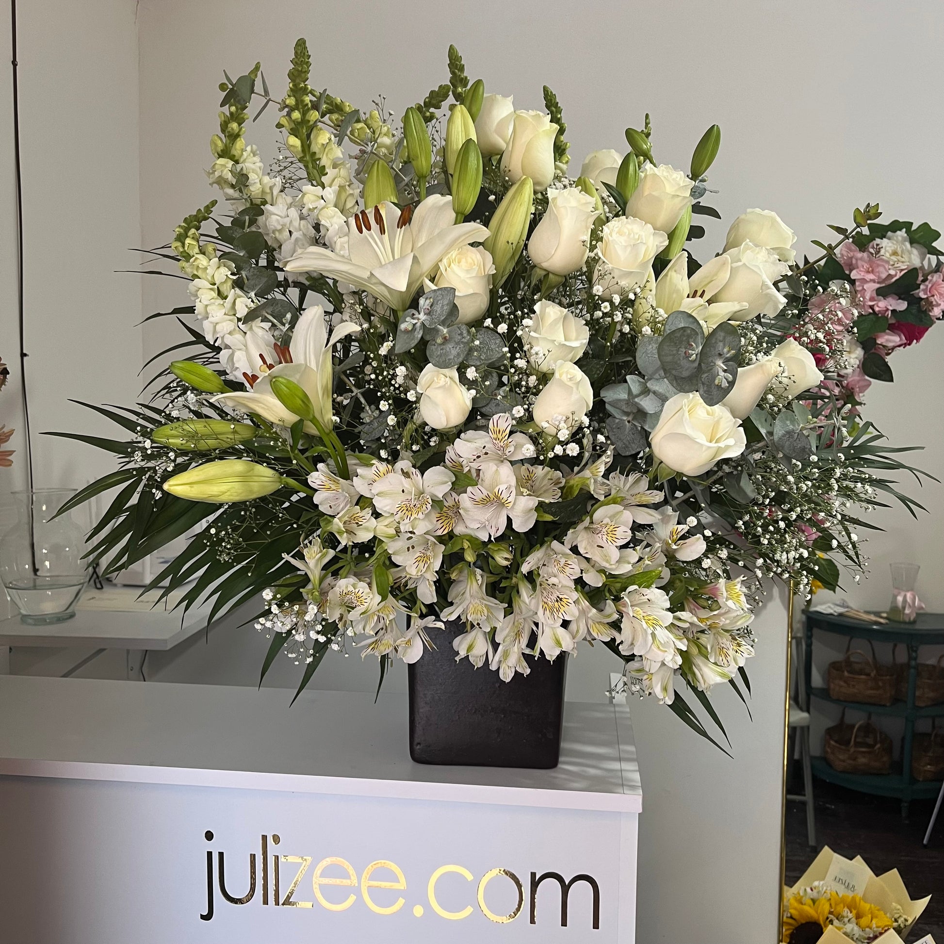 Elaborado con 12 rosas blancas, lilis, astromelias, perritos y delicados follajes, dispuesto en una base de cerámica que aporta sobriedad y distinción.