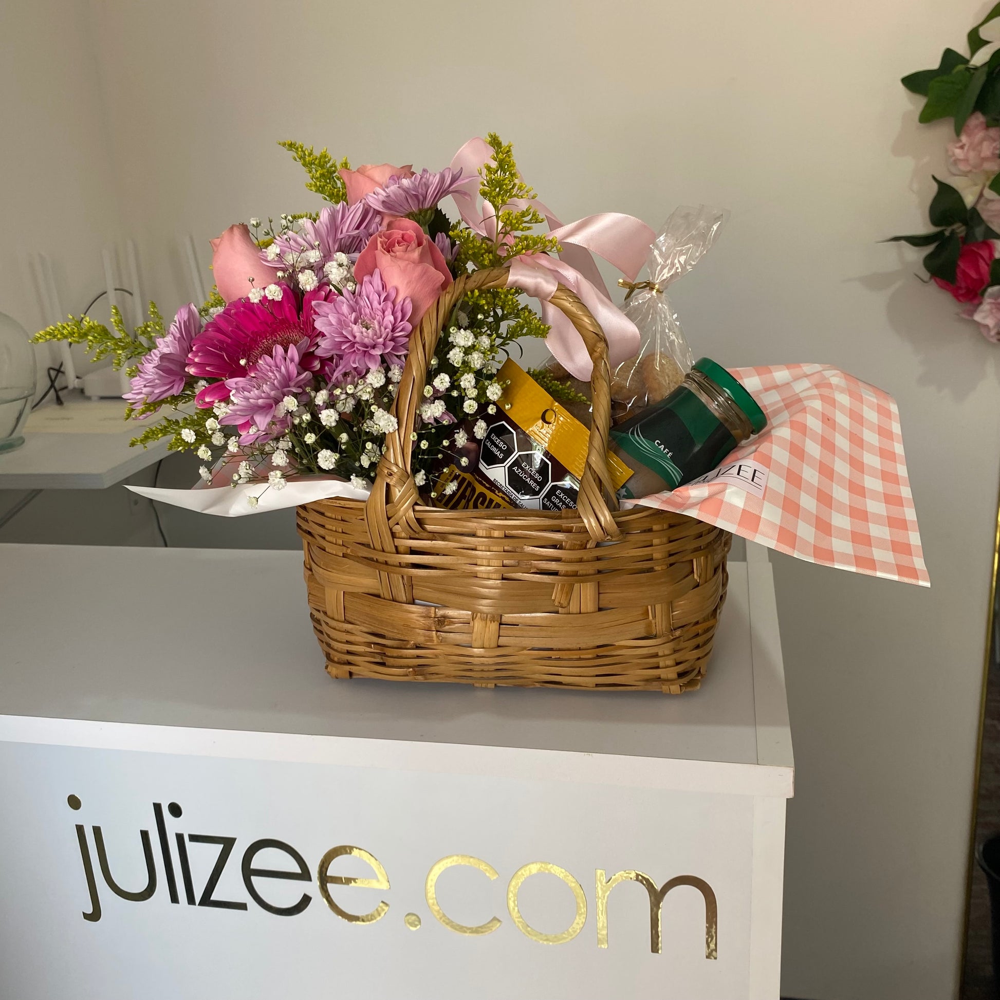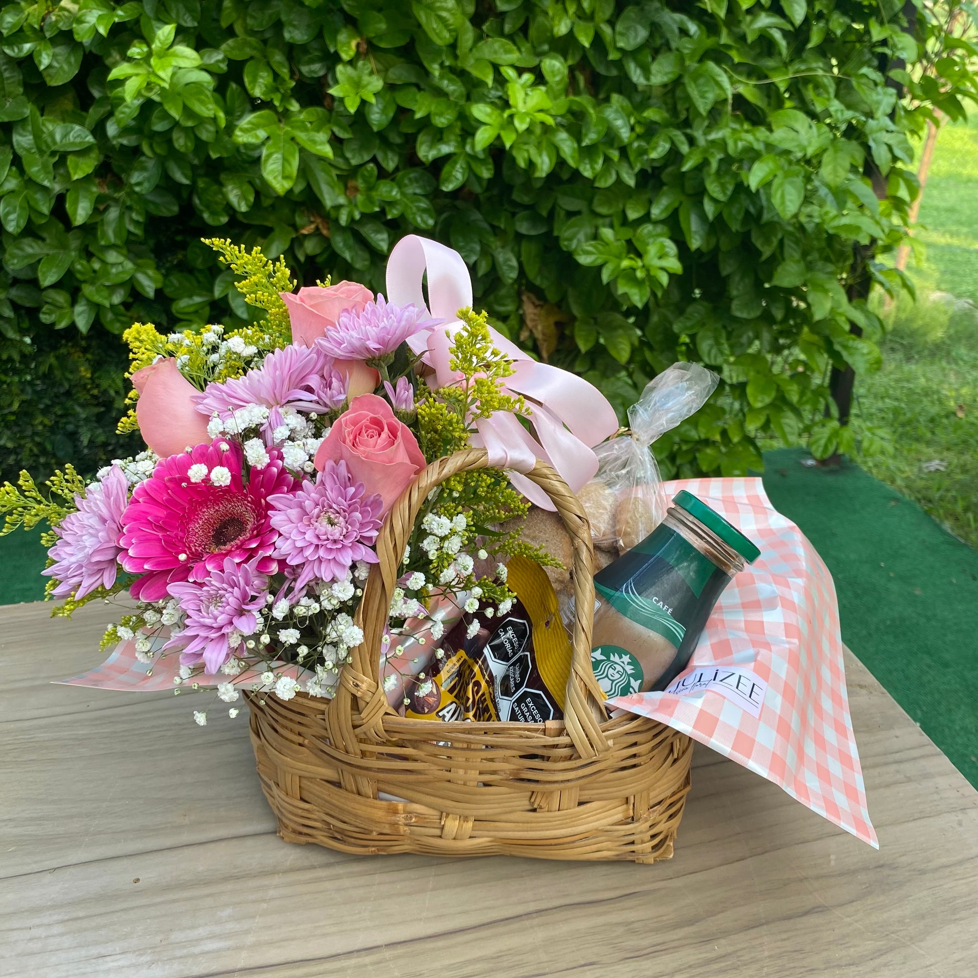 Un detalle perfecto para alegrar el día: hermosa canasta con 3 rosas, una gerbera, margaritas y delicados follajes que transmiten frescura y ternura. 🌸💖