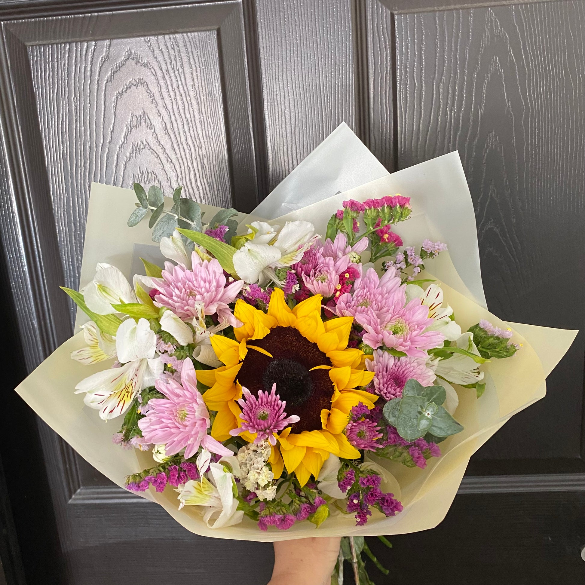 ✨ “Un radiante girasol en el centro ilumina este hermoso ramo, acompañado de delicadas margaritas, astromelias y toques de statice en tonos vibrantes. Las varas de eucalipto aportan frescura y elegancia, todo envuelto con suavidad en papel fino y un listón de tela que lo hace aún más especial. Un detalle lleno de vida, color y cariño.” 🌻💐