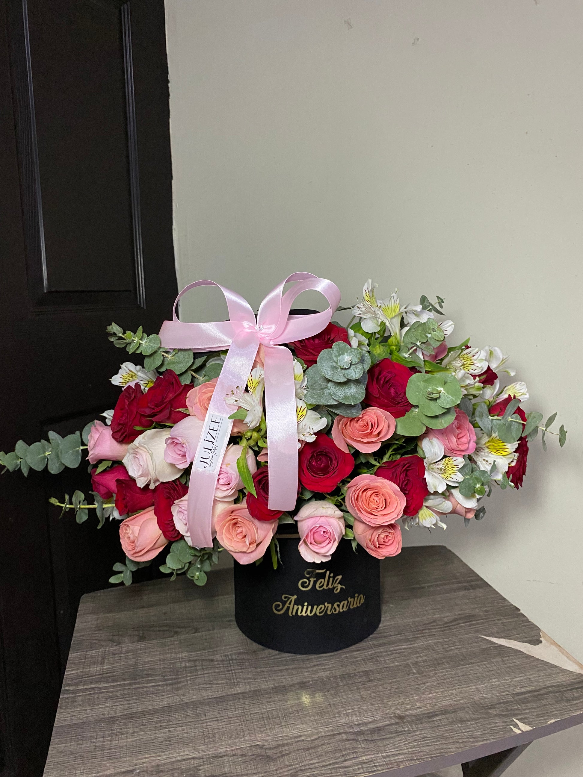 Este espectacular arreglo presenta 40 rosas de alta calidad en tonos combinados, dispuestas con astromelias y dólar dentro de un estiloso cilindro. El detalle que lo hace perfecto para la ocasión es la frase "Feliz Aniversario" delicadamente colocada en el cilindro. Es un regalo que expresa amor y celebración en cada detalle.