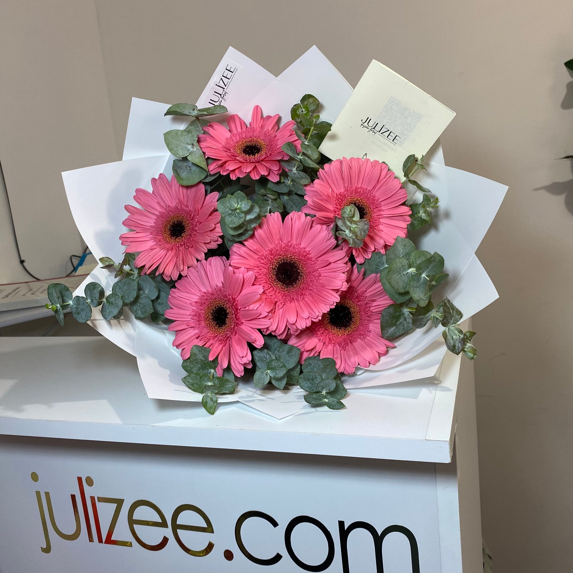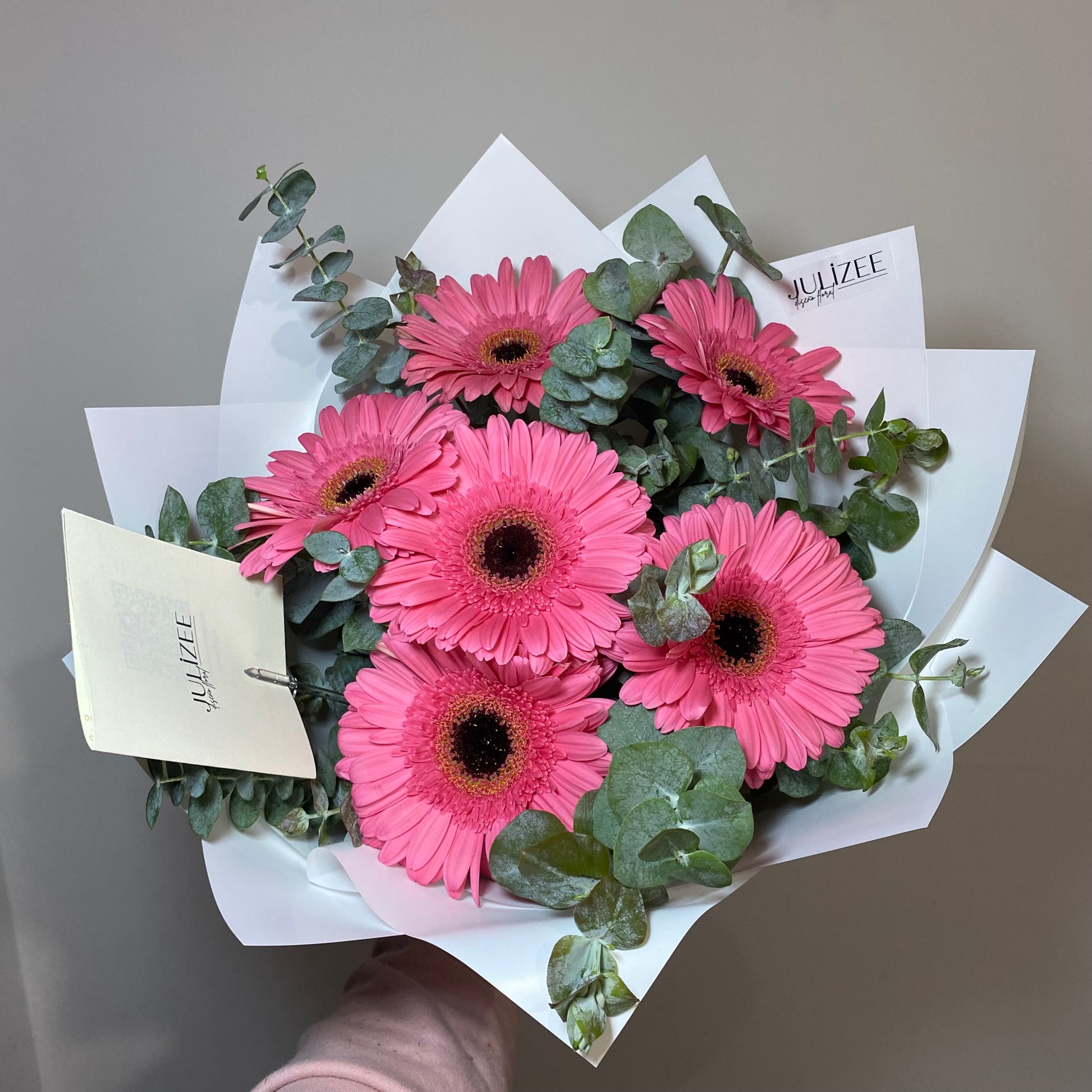 “Un hermoso ramo de 6 gerberas en tono rosado que irradian alegría y ternura, acompañadas de varas de eucalipto que no solo aportan frescura, sino también un aroma especial y envolvente. Un detalle delicado y lleno de vida para regalar sonrisas y momentos inolvidables en cualquier ocasión.”