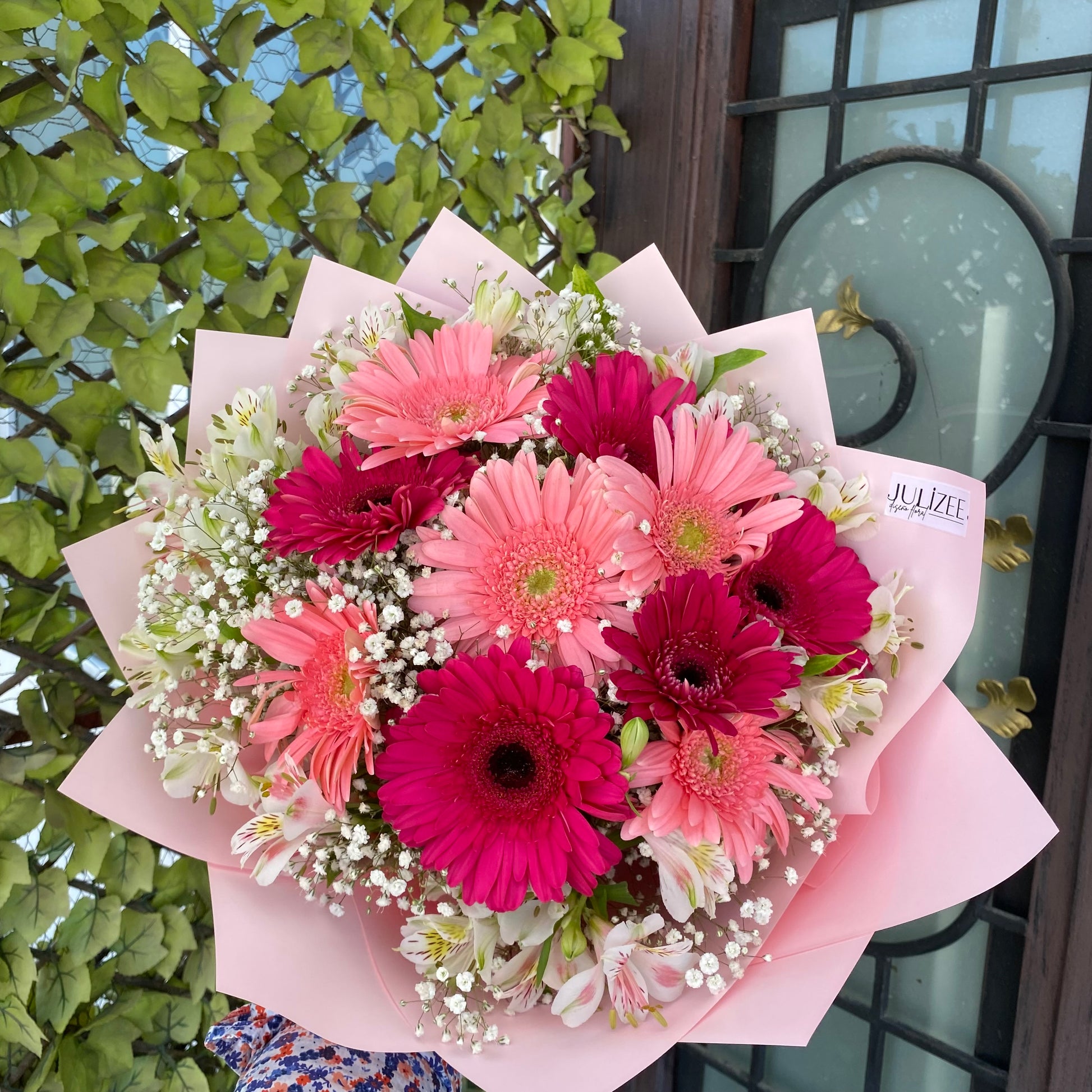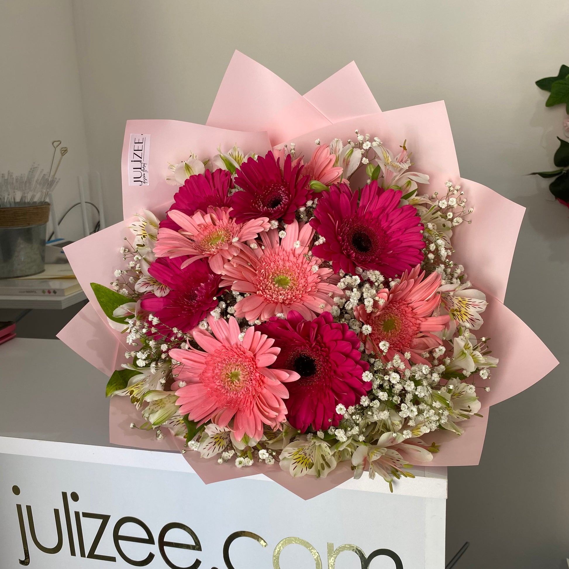 “Un delicado ramo lleno de color y alegría: 10 gerberas en tonos rosas y fucsias que iluminan con su frescura, acompañadas de la suavidad de las astromelias y la dulzura de la gypsofilia. Un detalle perfecto para transmitir amor, ternura y sonrisas en cada pétalo.”