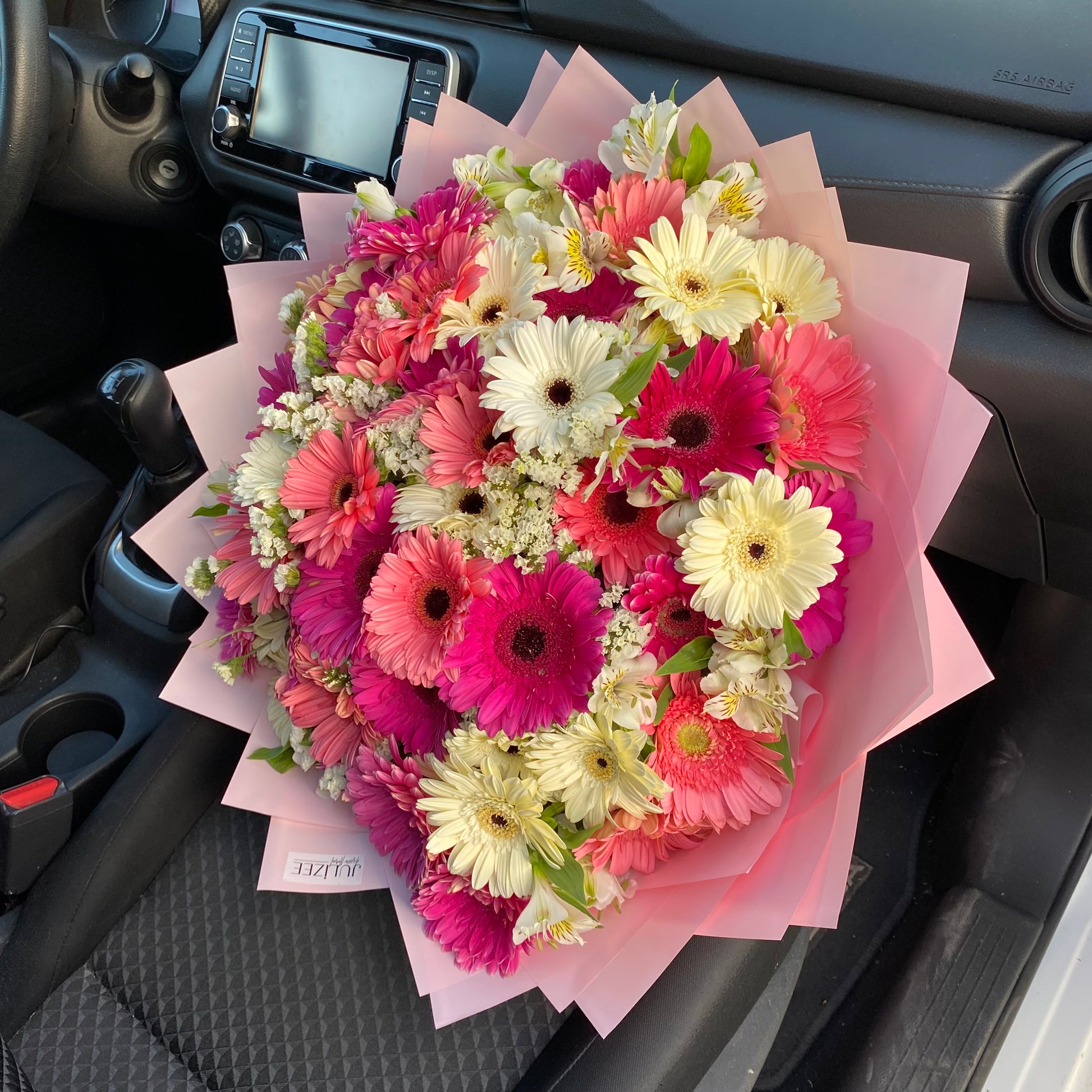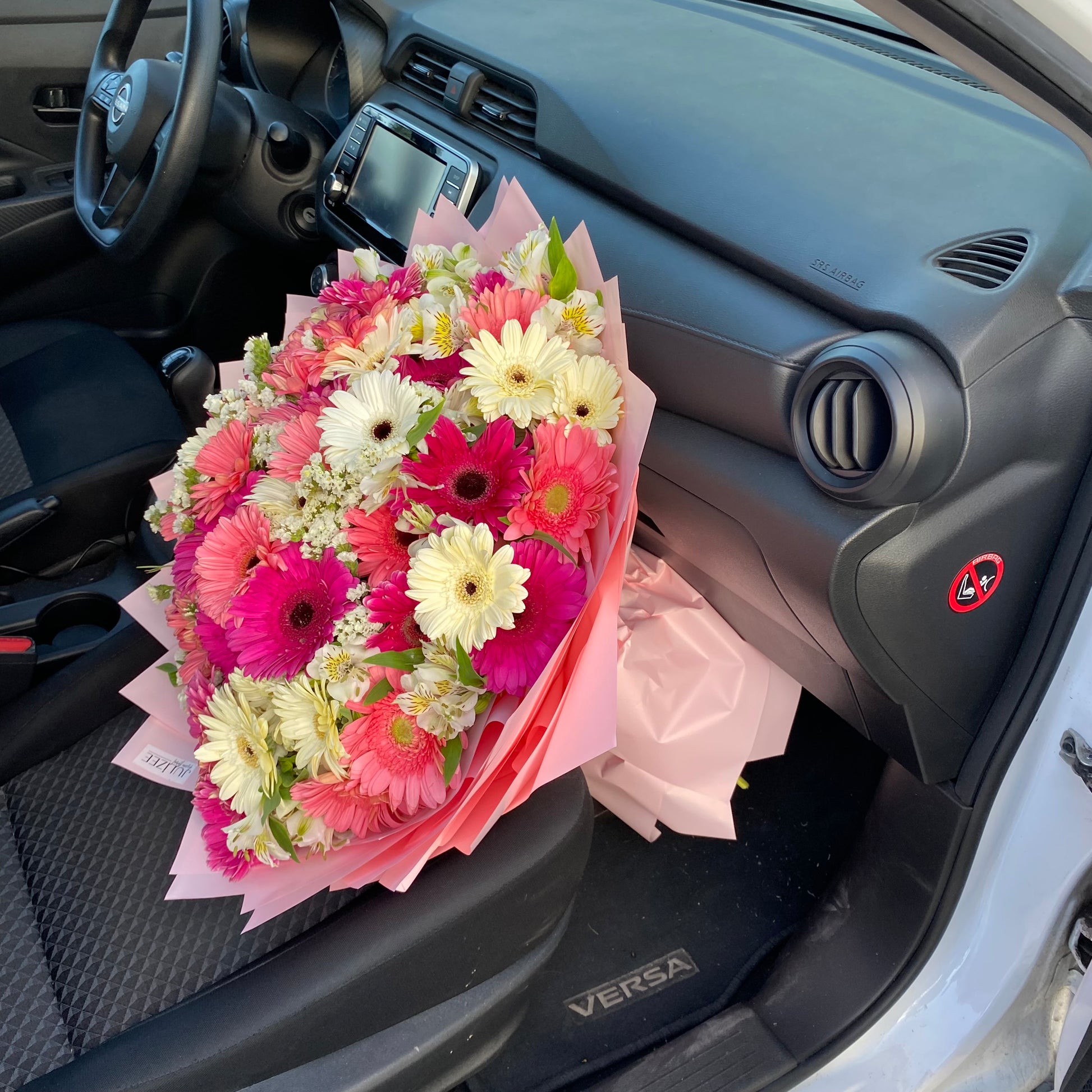 Este ramo es un estallido de alegría y frescura. Consta de 50 gerberas en tonos vibrantes de rosa, fucsia, blanco y crema, acompañadas de astromelias delicadas y statice, todo envuelto en un papel elegante que realza su colorido. Su aspecto es luminoso y lleno de vida, como un abrazo floral que transmite entusiasmo y energía positiva.